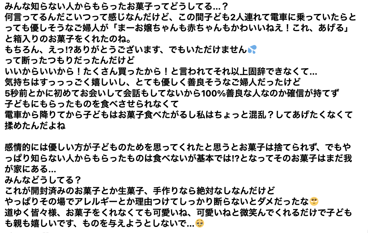 - 注目の理由:知らない他人からのお菓子受け取りは、善意と安全意識が衝突する現代的課題